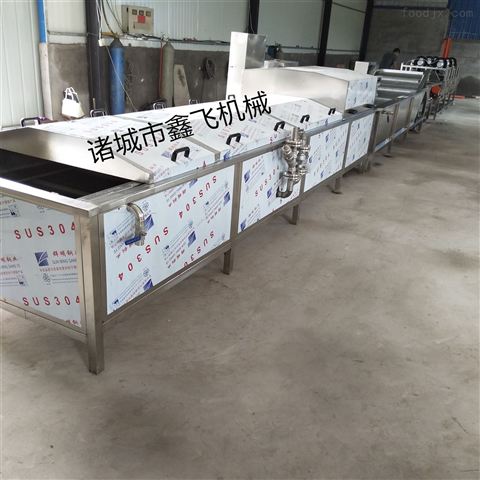 毛輥清洗去皮機(選配) → 提升輸送機→ 毛刷去雜機→氣泡清洗機→雙層輸送機→球根莖類切菜機→葉菜類切菜機→提升輸送機→氣泡漂洗機→氣泡脫鹽機→噴淋氣泡脫鹽機→振動瀝水機→脫水機(選配)→壓榨機(選配)→提升輸送機→連續(xù)拌料機→真空包裝機 →巴氏殺菌機→冷卻機→振動瀝水機→翻轉(zhuǎn)風干機